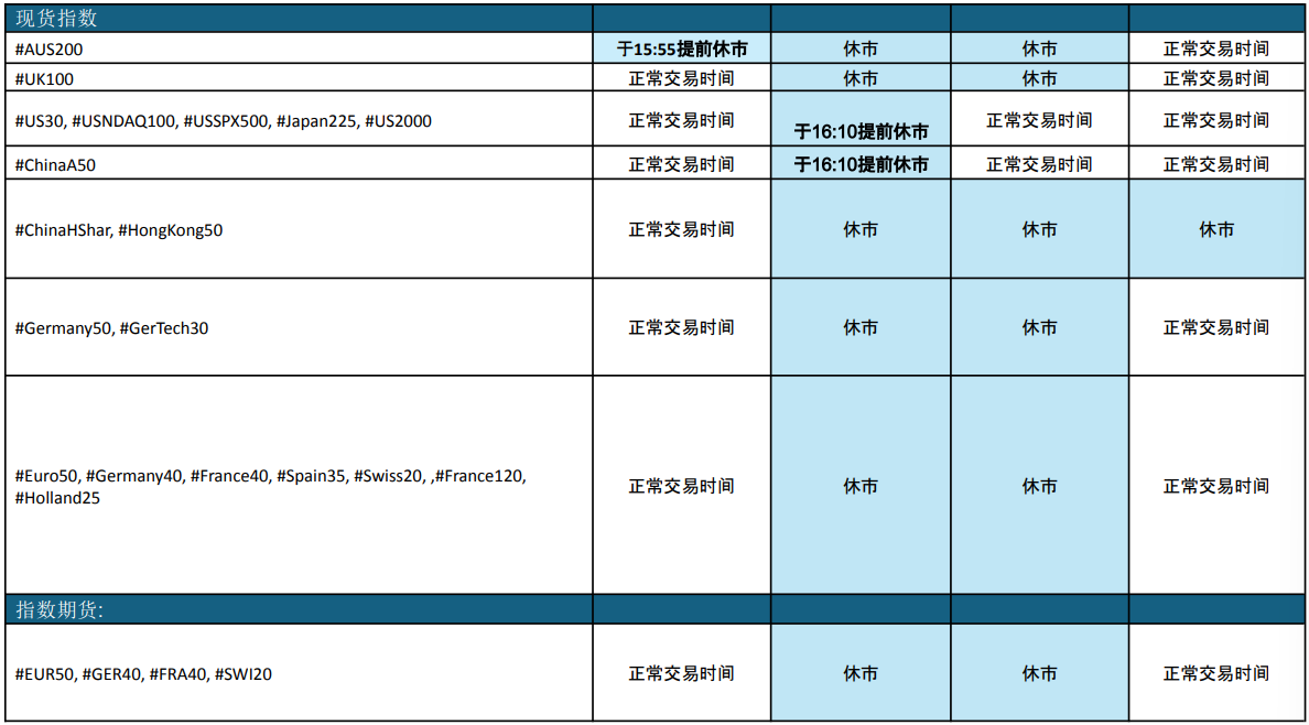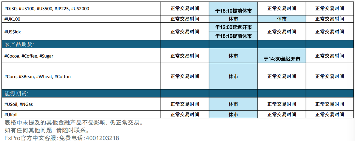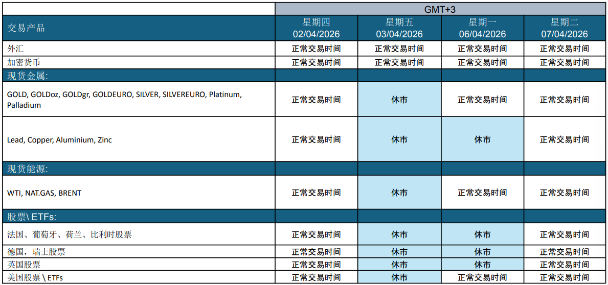 温馨的提示您,2026年4月2日至4月7日复活节假日期间,部分产品的交易时间有所变动,请查看下表了解受影响的产品。