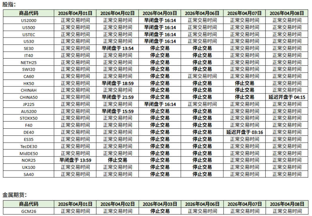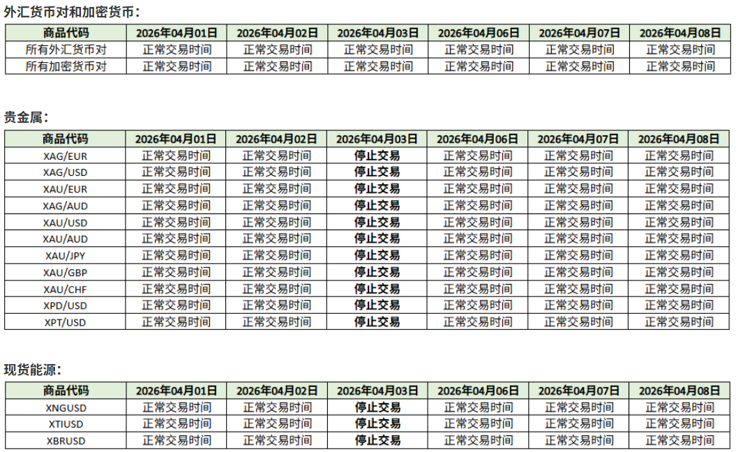 请查看我们更新的2026年04月01日至2026年04月03日 及 2026年04月06日至2026年04月08日的耶稣受难日 & 复活节交易时间表。
